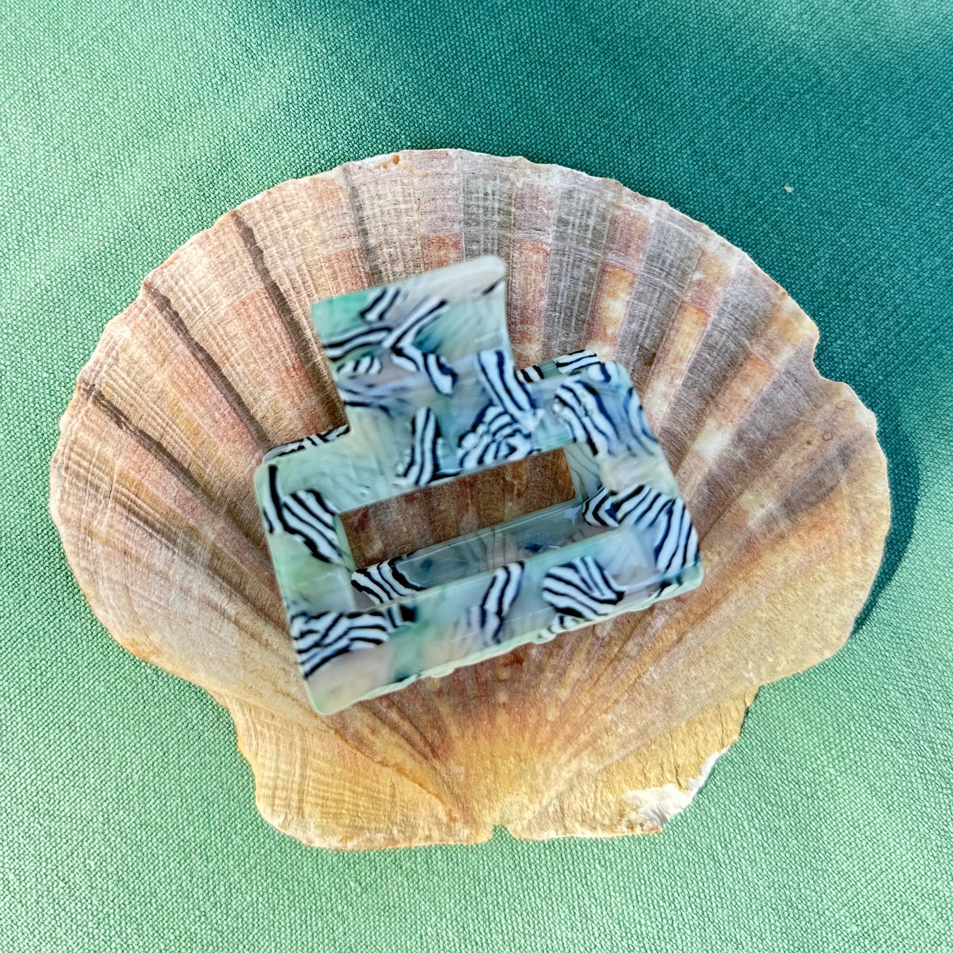 Zebra Haze: This hair clip features a unique and playful pattern that combines black-and-white zebra stripes with soft pastel tones like sage green, blush beige, and hints of translucent ivory.